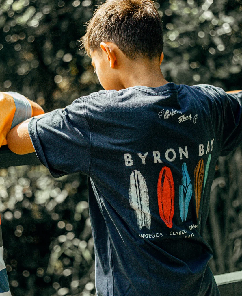 Our best selling Surf Town tee, the Boards Tee now available in Children's Sizes.. Available for Noosa, Byron Bay and Flinders, (colours may vary). Ā A classic fit tee with unique surf town location and board design on back.